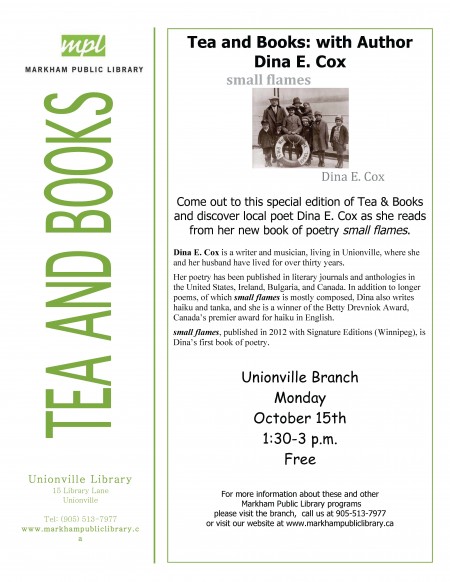 Come out to this special edition of Tea & Books and discover local poet Dina E. Cox as she reads from her new book of poetry small flames.